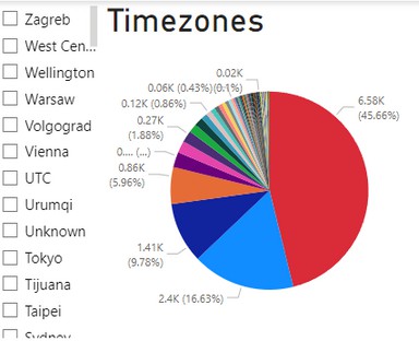 The below pie chart shows the distribution of user time zones, with the ‘Pacific Time (US & Canada)’ timezone accounting for 16.63% of users. ‘Eastern Time (US & Canada)’ and ‘Central Time (US & Canada)’ are the second and third largest segments, respectively. Other global time zones are represented by smaller segments. The percentages and actual counts provide insights into the geographical diversity of the user base.