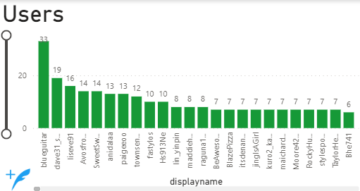 The bar graph displayed below shows the number of messages sent by individual users, with ‘blueguitar’ leading with 33 messages, followed by ‘dave31_sam’, ‘’liseve91’, and ‘AvosfromMexico’. This graph offers a quick visual representation of the most active users in the dataset.