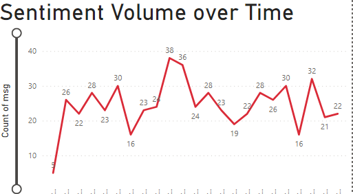 The line graph depicts the fluctuations in sentiment volume over time, marked by specific dates and times. The highest point reached 38 messages at a particular time, indicating a surge in user engagement, while the lowest points suggest periods of lesser activity or less intense sentiment expression.