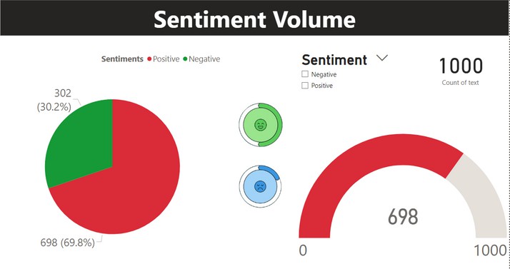 The dashboard presents a sentiment analysis of a dataset that includes 1,000 textual entries. The sentiment analysis is broken down into positive and negative categories, which are represented through three distinct visual elements.