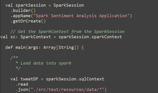 A Spark session (sparkSession) is created using SparkSession.builder() to configure session properties like the application name. The sparkSession is used to create a DataFrame (tweetDF) by reading JSON files from a specified path (“./src/test/resources/data/*”) and the read.json method is used to read JSON files into the DataFrame.