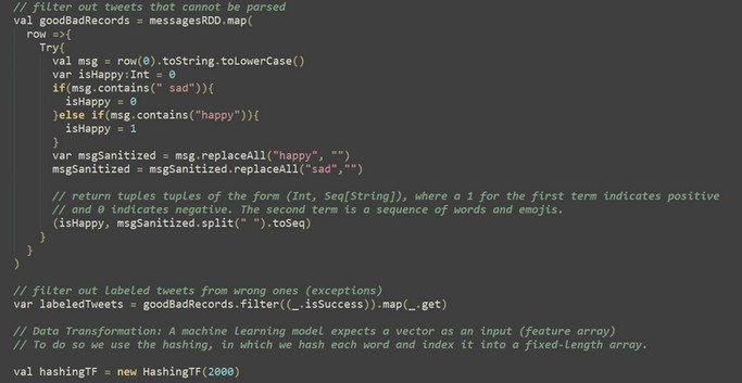 Text data is transformed into numerical features using HashingTF from MLlib: Words in each tweet are tokenized and converted into a sequence, the sequence of words is transformed into a fixed-length numerical vector using hashing.