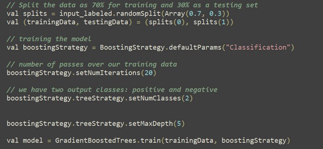 The labeled data is split into training and testing sets (70% training, 30% testing). A boosting strategy is defined (BoostingStrategy) for Gradient Boosted Trees (GBT). Parameters such as number of iterations (setNumIterations), number of classes (setNumClasses), and maximum depth (setMaxDepth) are set. The GBT model is trained using GradientBoostedTrees.train with the specified boosting strategy and training data. Typically, after training, the model’s performance is evaluated on the testing set to assess its accuracy, precision, recall, etc. The trained model is saved to disk using model.save(sc, “./model/”) for later use or deployment.